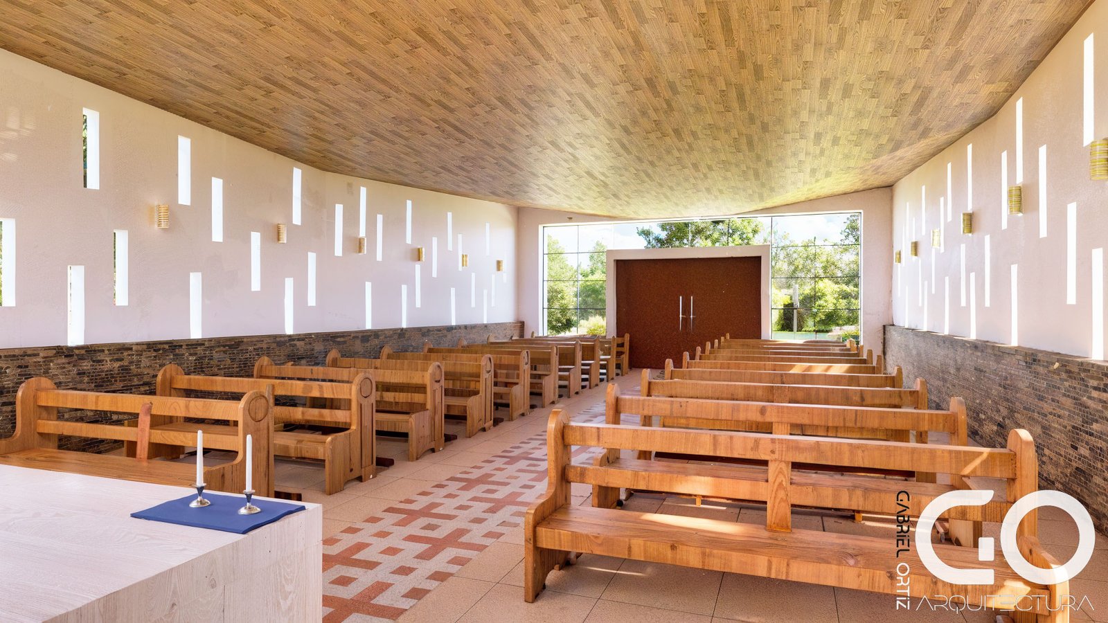 La luz como material constructivo: El diseño interior se rige por la pureza del blanco absoluto, maximizando la luminosidad y eliminando cualquier distracción visual. La luz natural se gestiona mediante un doble sistema: un gran ventanal de bienvenida en el atrio y una apertura posterior que encuadra la imagen de Cristo sobre un fondo de naturaleza viva, utilizando el exterior como un retablo natural en constante cambio.