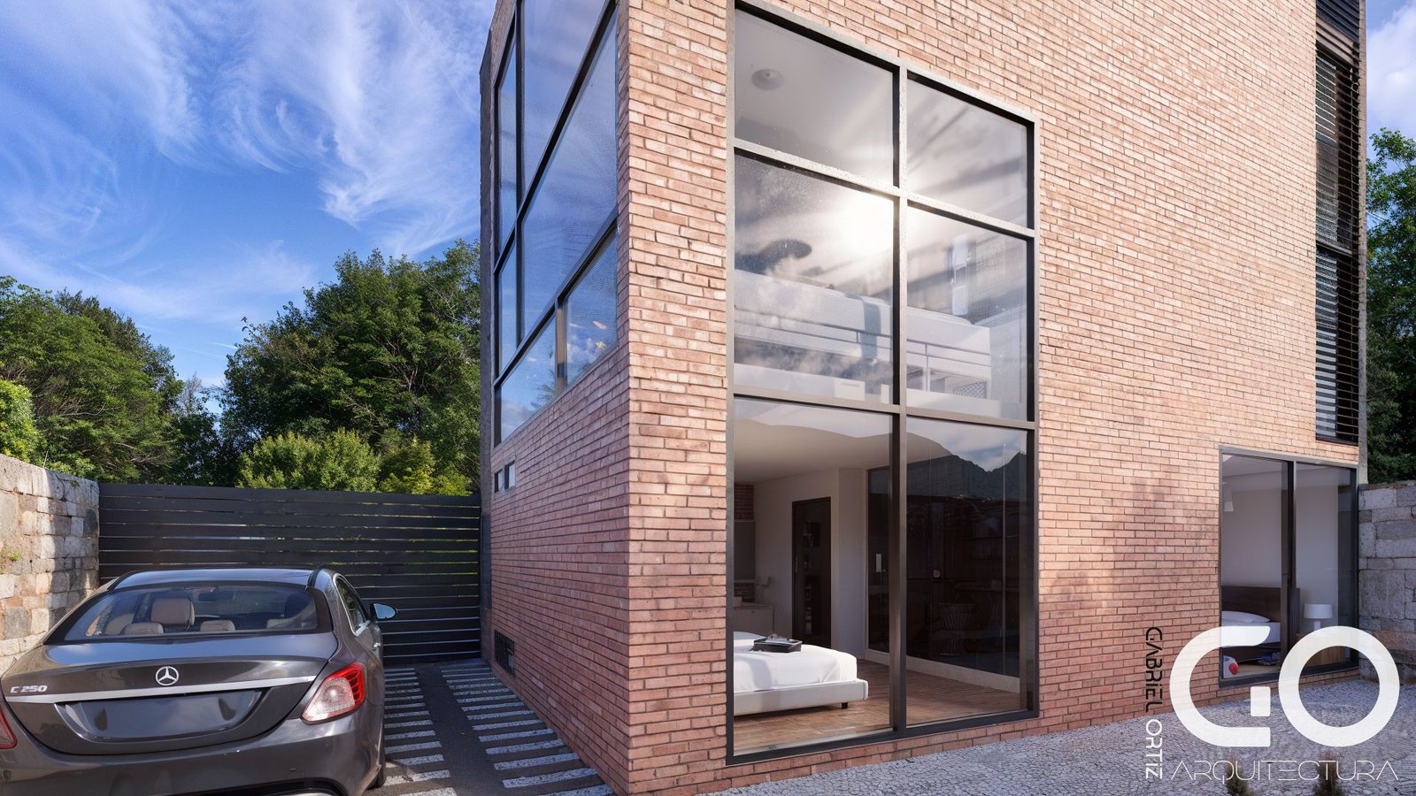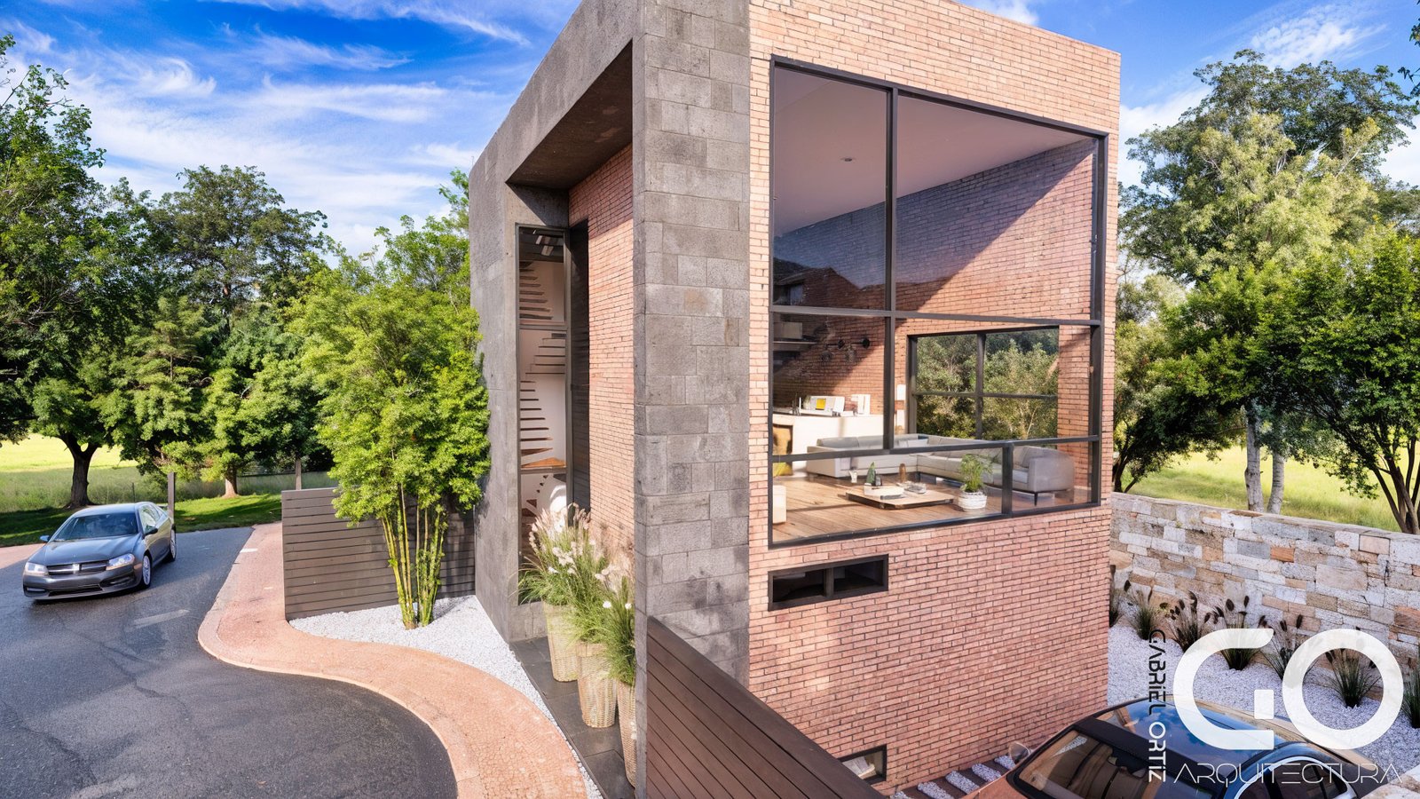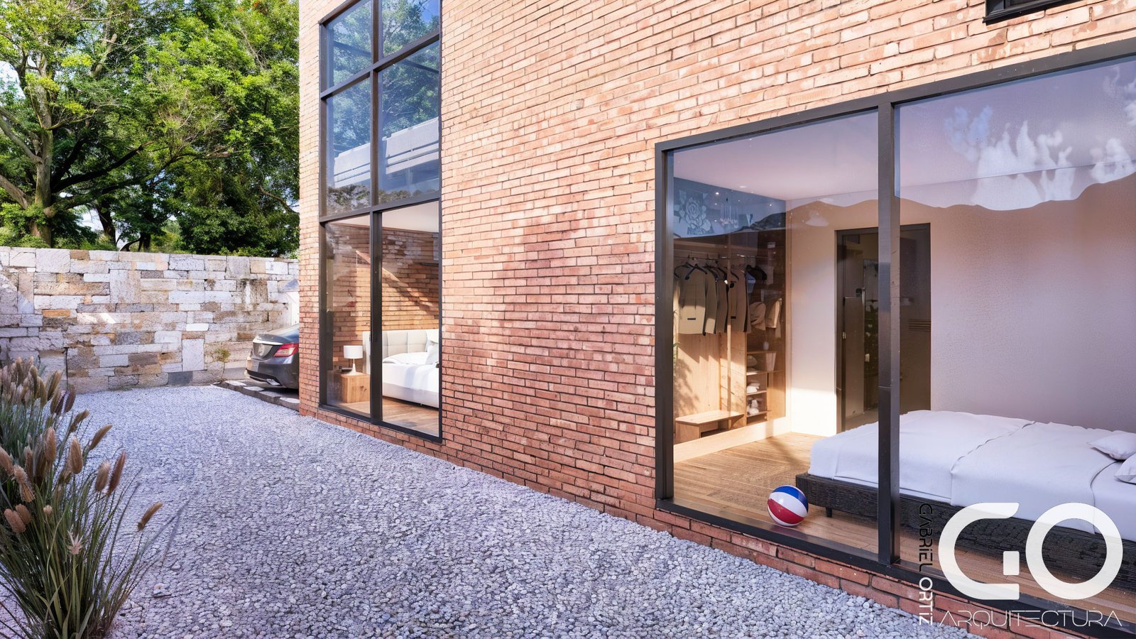 • Umbral de Piedra: El acceso se resuelve con muros de piedra y grava fina, creando una transición sensorial y segura desde la calle hacia el interior.