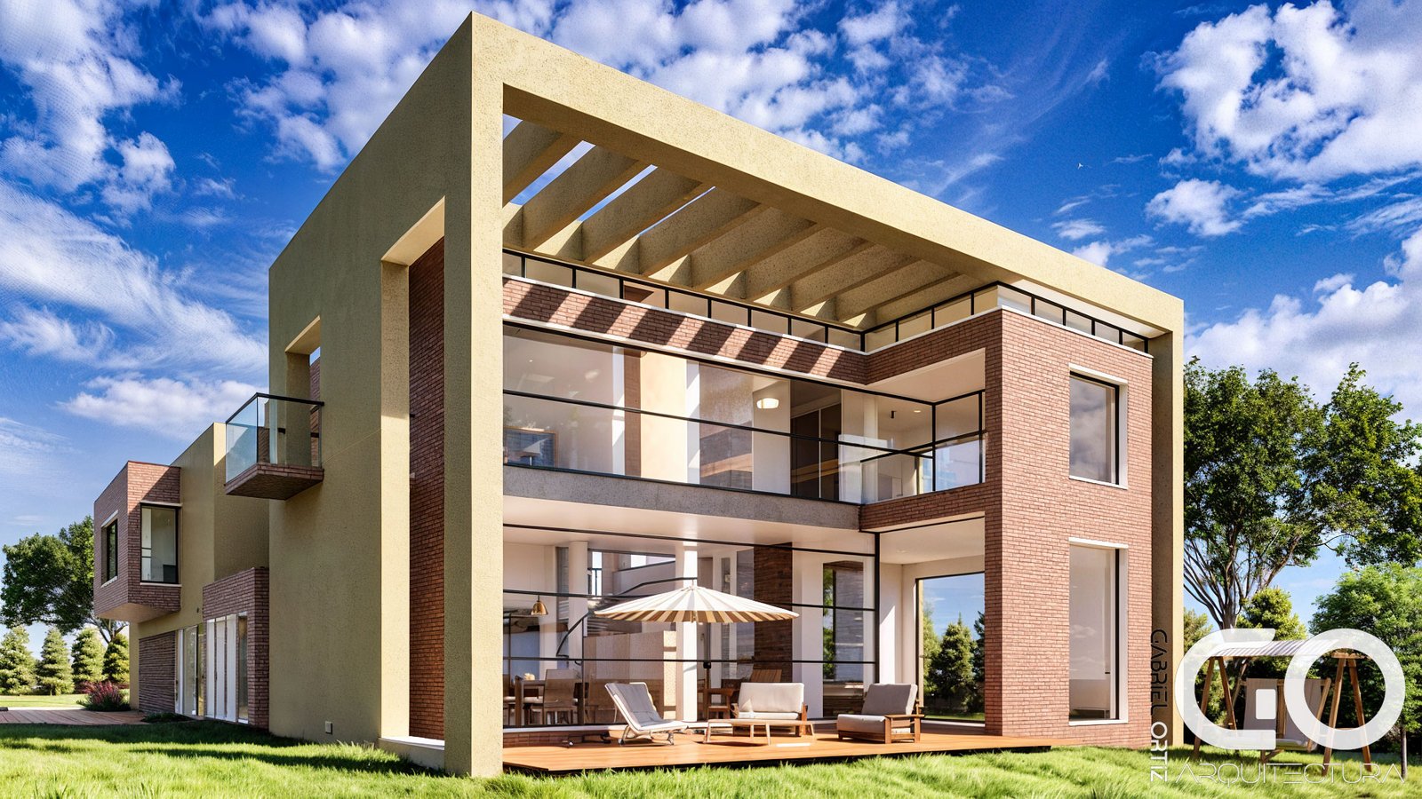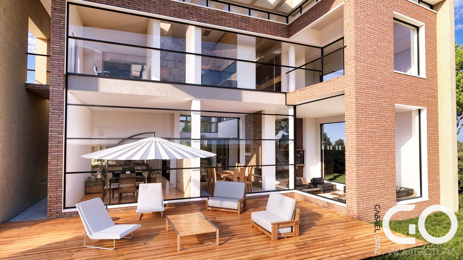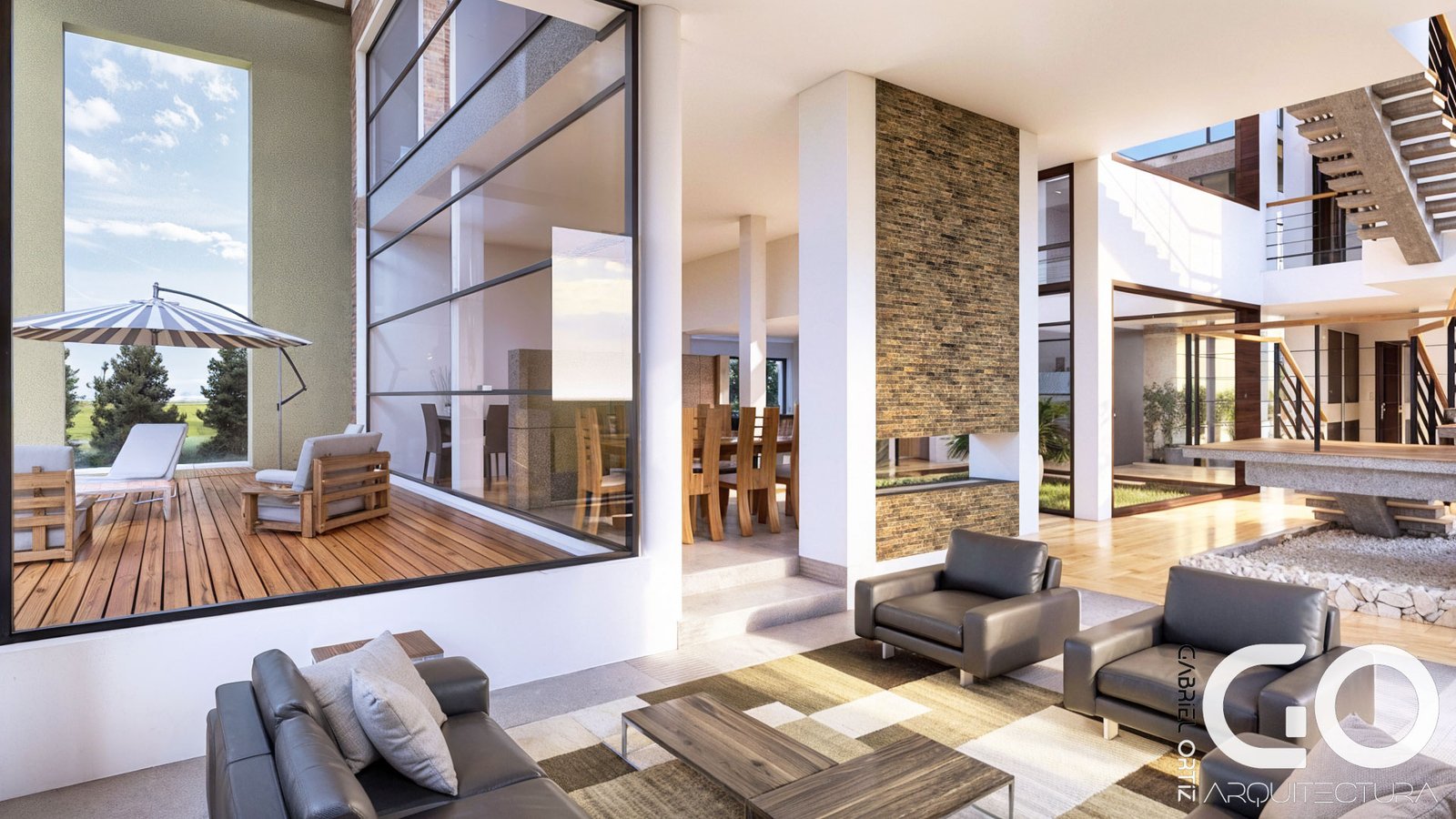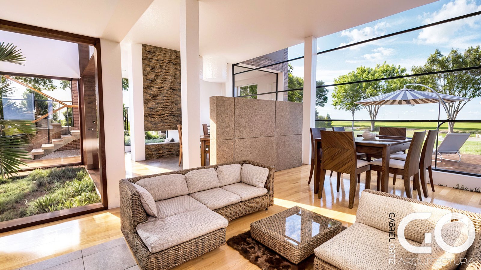 Escala monumental y luz protegida: El salón principal aprovecha una doble altura impresionante para capturar la luz del cielo. Para asegurar el confort, hemos integrado un sistema de pérgolas que filtran la radiación solar, transformándola en una iluminación suave y acogedora que realza la nobleza de los acabados.