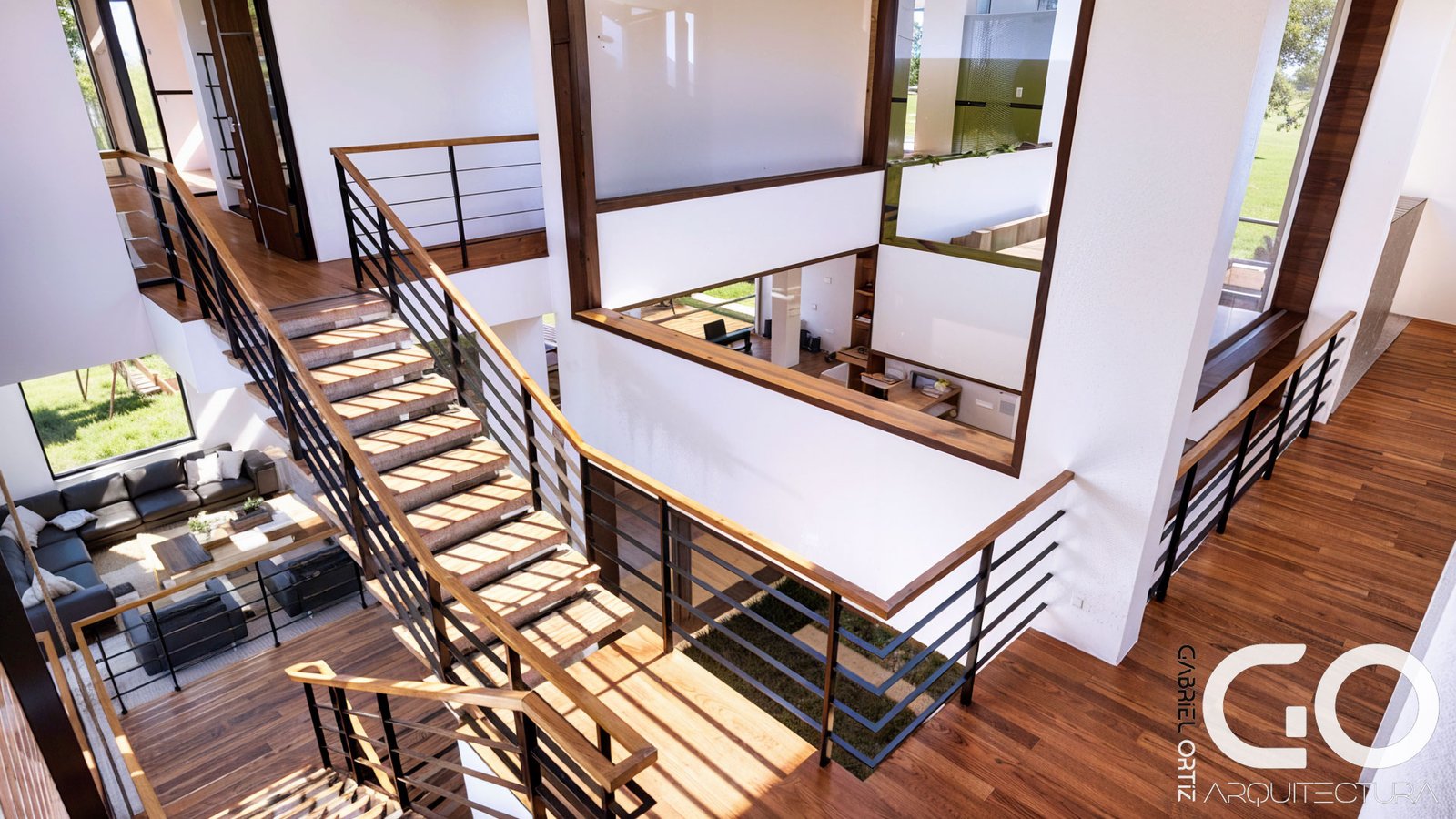 Escalera Escultórica: La conexión entre niveles se resuelve con una pieza de arte funcional en concreto y madera que parece flotar, conectando visualmente el área social con el ala privada.