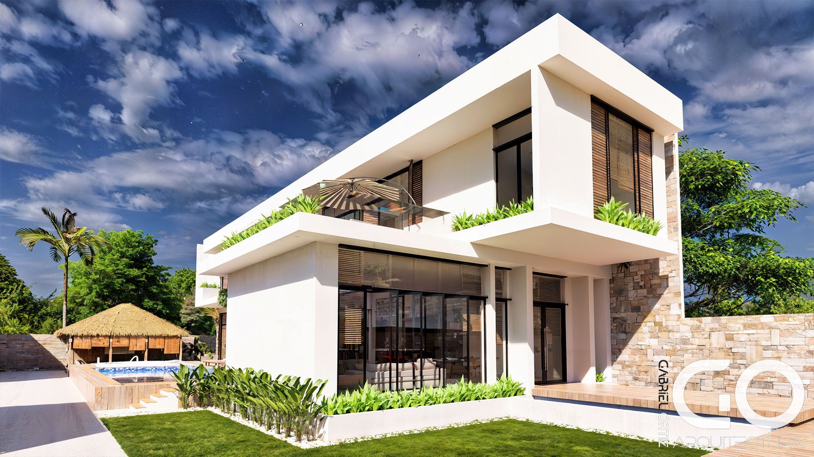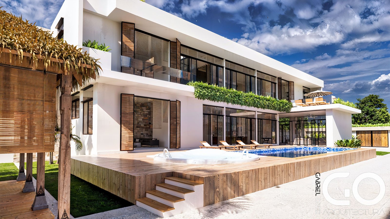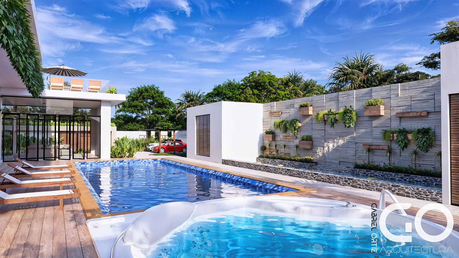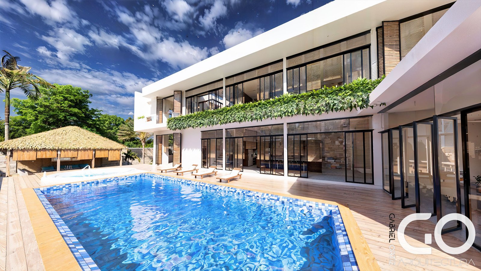 • Núcleo Social y Wellness: El primer nivel vincula la cocina gourmet y la zona BBQ con una piscina de diseño especializado, que incluye un solárium sumergido para una experiencia de descanso total. El exterior se completa con un kiosco high-tech dotado de audio profesional, rodeado de palmeras que garantizan privacidad y frescura.