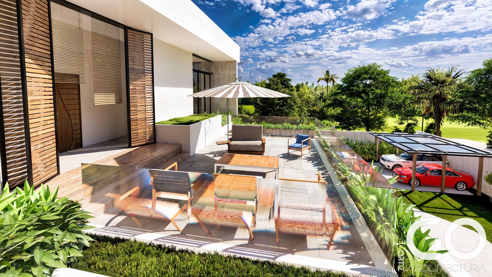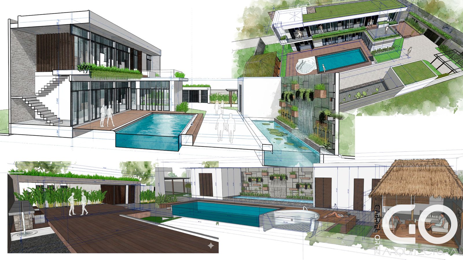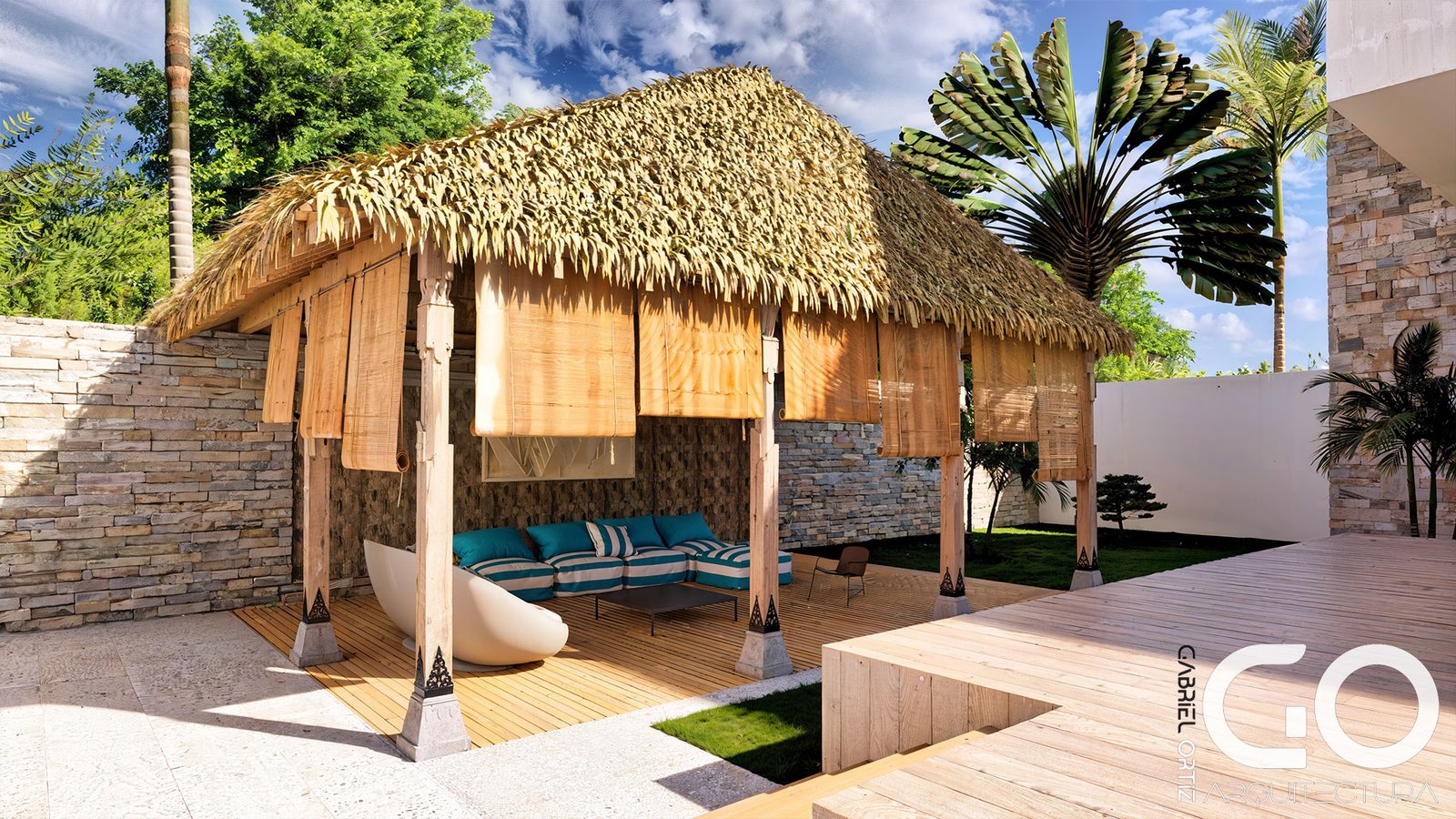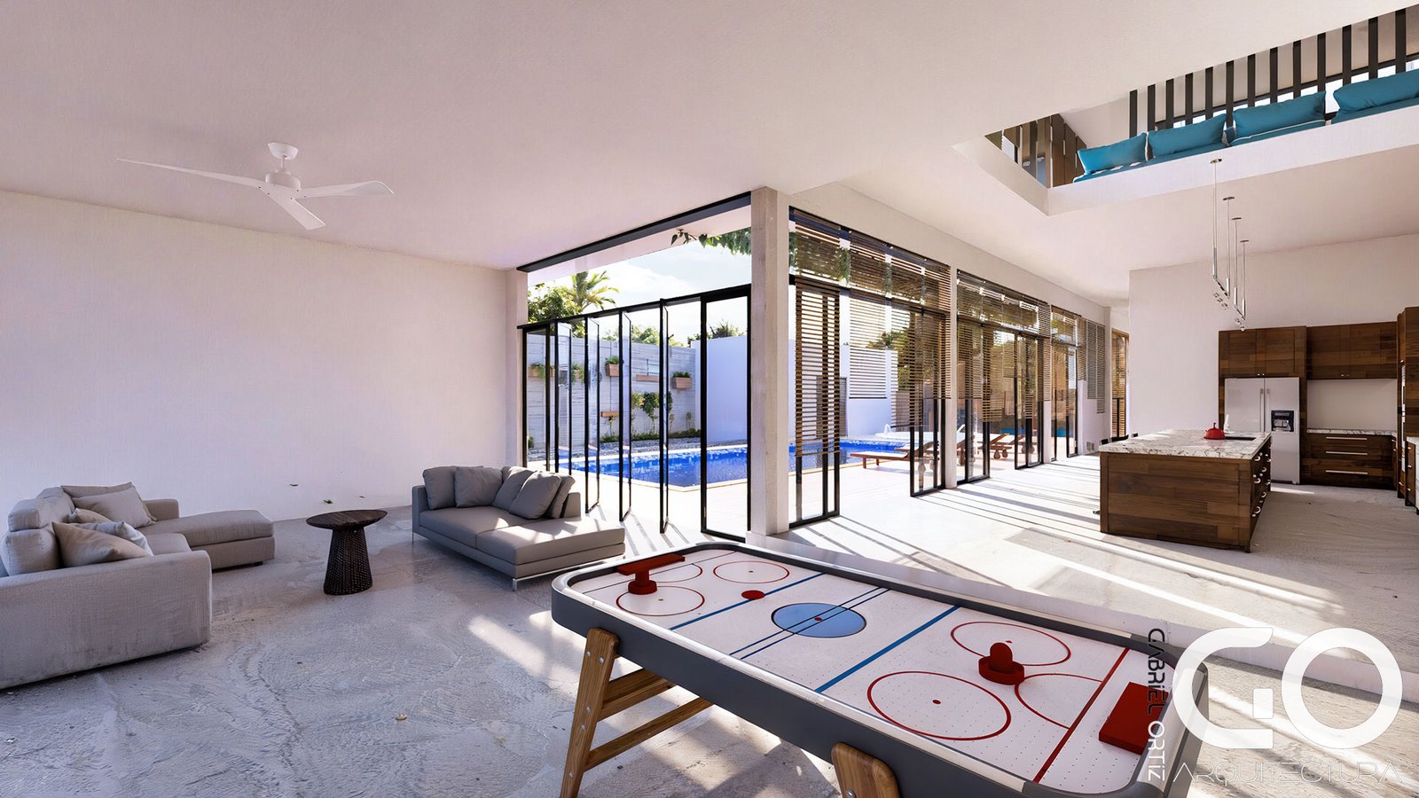 • Núcleo Social y Wellness: El primer nivel vincula la cocina gourmet y la zona BBQ con una piscina de diseño especializado, que incluye un solárium sumergido para una experiencia de descanso total. El exterior se completa con un kiosco high-tech dotado de audio profesional, rodeado de palmeras que garantizan privacidad y frescura.