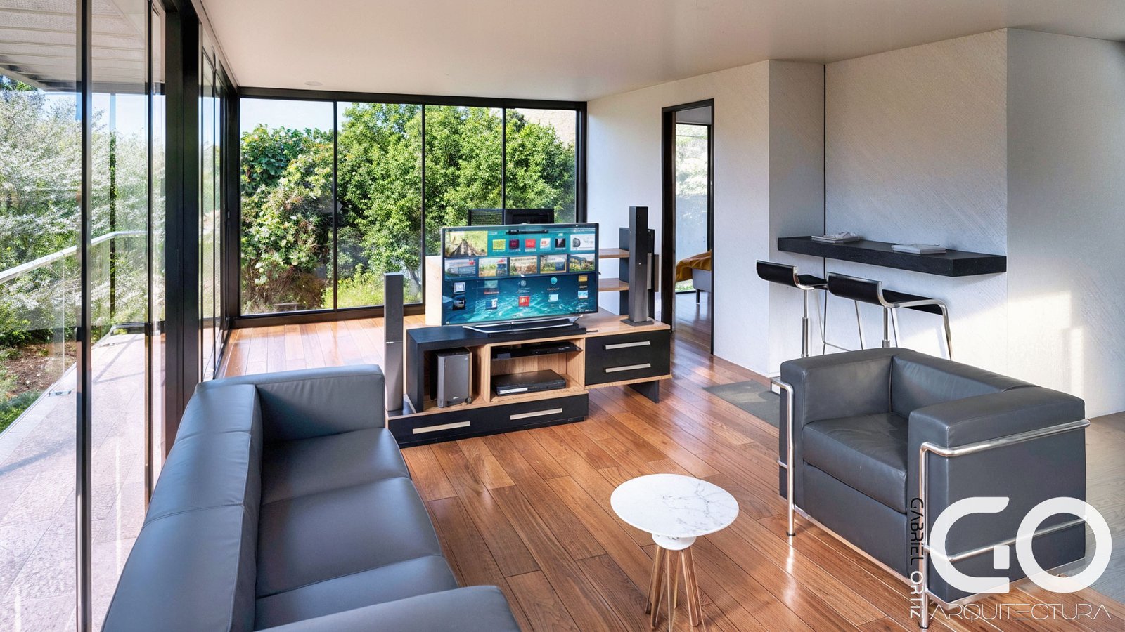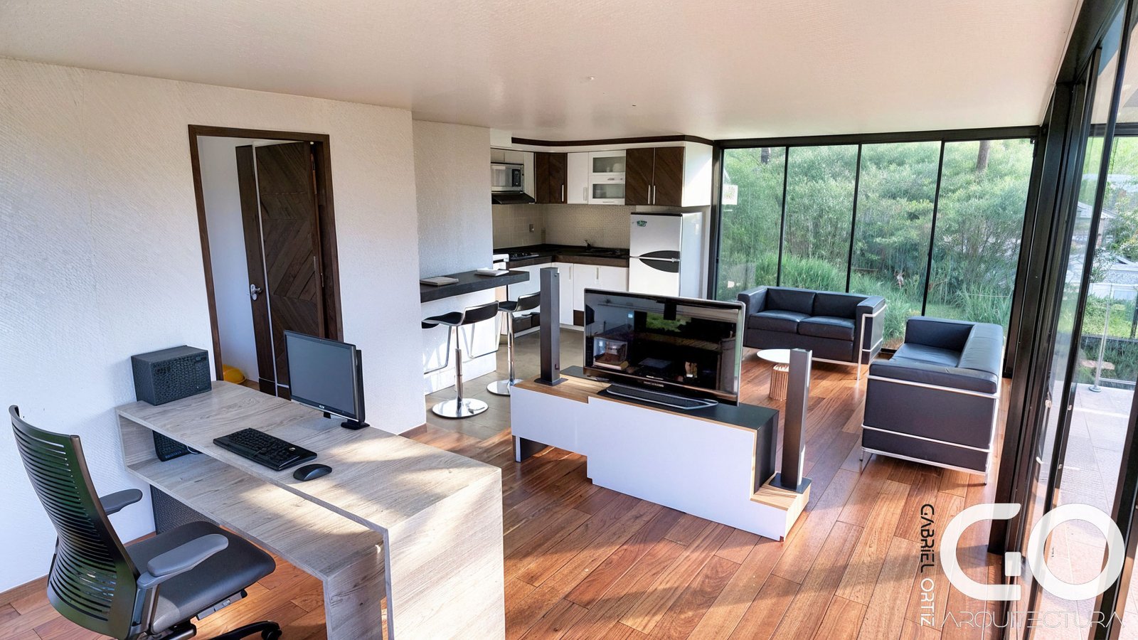 Zona Social (Acero y Vidrio): Una sala y estudio diseñados con grandes luces para una sensación de libertad absoluta. Se proyecta como una “linterna de cristal” que inunda los espacios de luz natural.