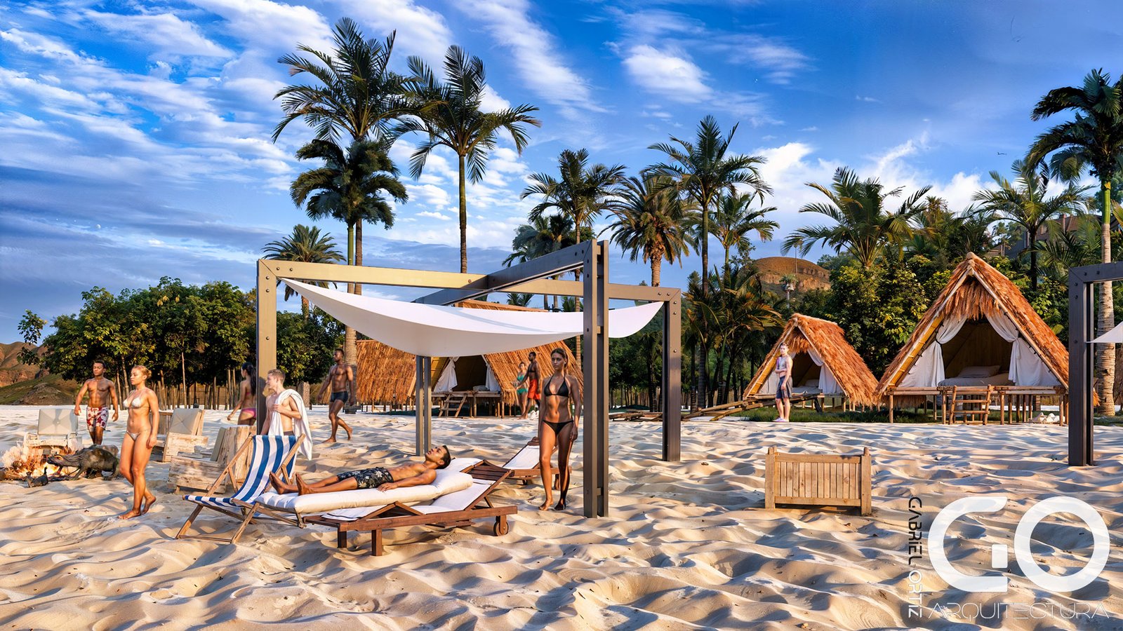 Microclimas de Sombra: El diseño exterior integra arquitectura textil y techos de paja de alta densidad, proporcionando un aislamiento térmico superior y configurando áreas de socialización con fogatas y asoleadoras orientadas estratégicamente hacia el mar.