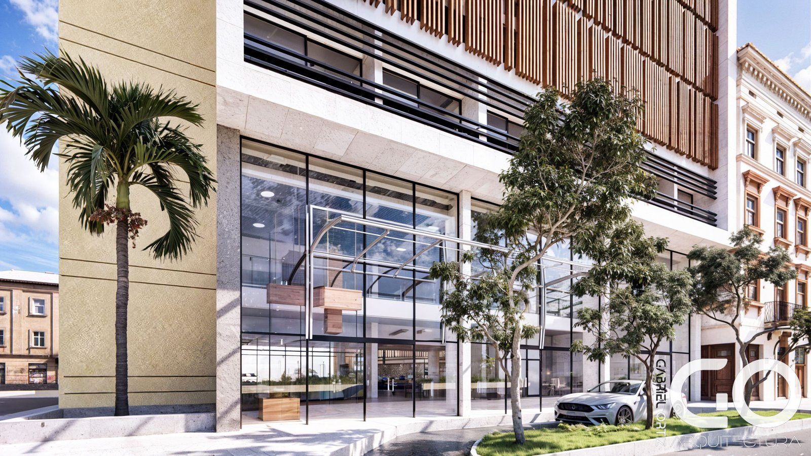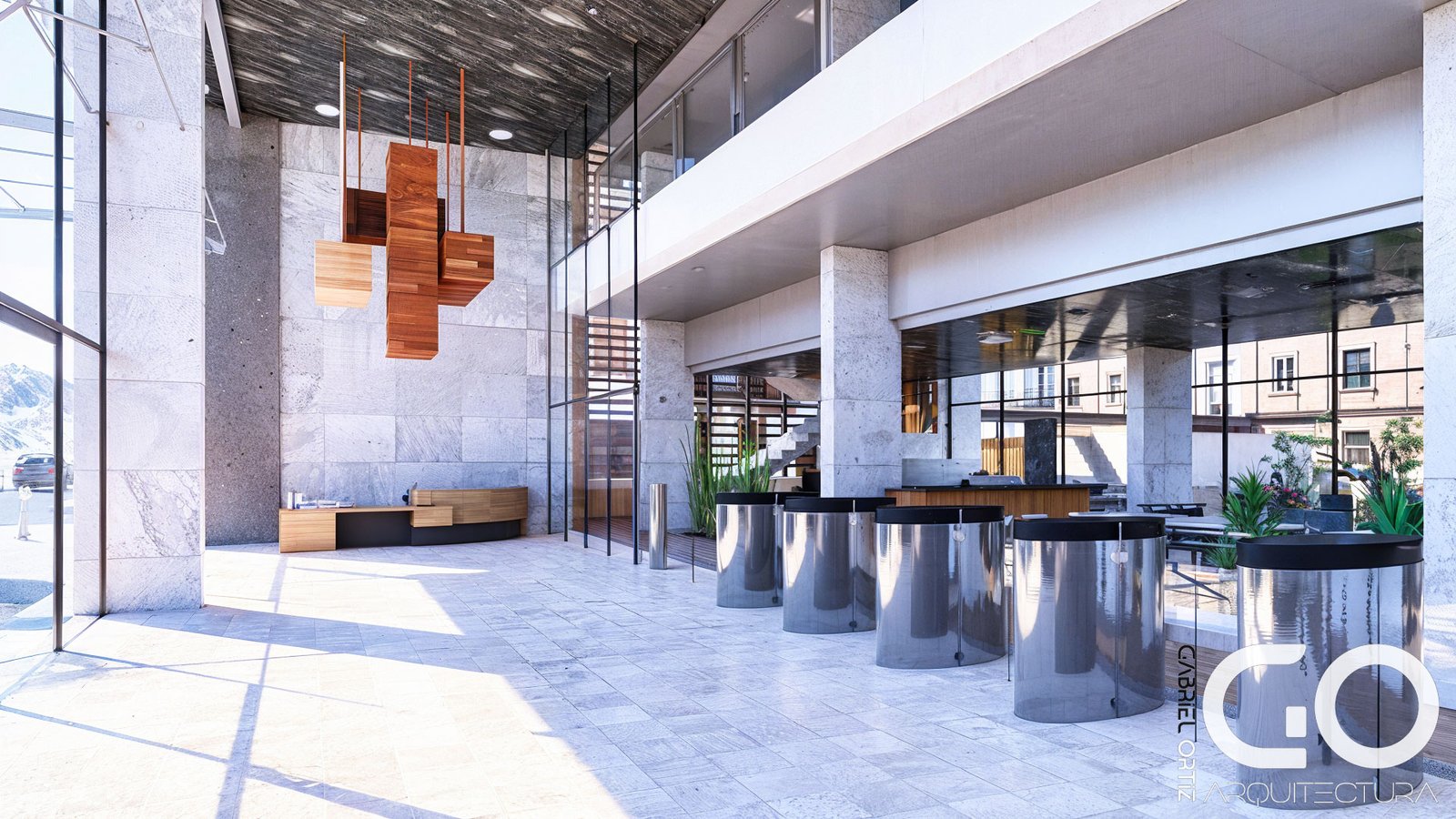 El Umbral de Doble Altura: Al entrar, un vestíbulo monumental de gran escala nos recibe, disipando la sensación de densidad exterior. Este espacio híbrido integra un café y zonas de co-working, diseñadas para que el trabajo y la vida social fluyan bajo una luz natural envidiable.