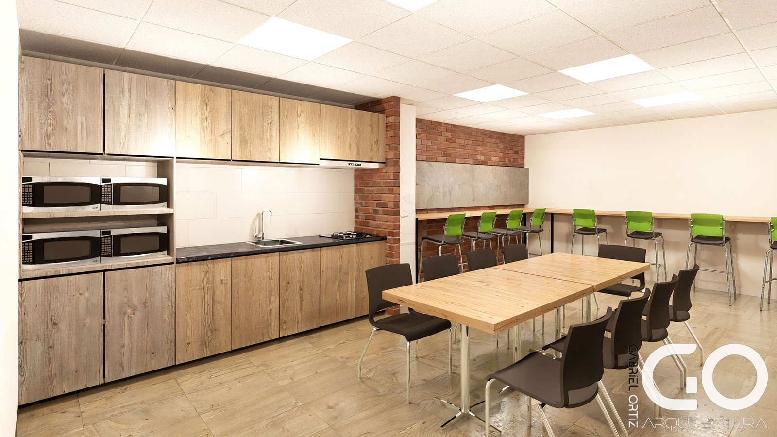 Área de Lunch: Configurada como un espacio de desconexión total, cuenta con cocina equipada, torres de hornos y mobiliario perimetral de diseño moderno.