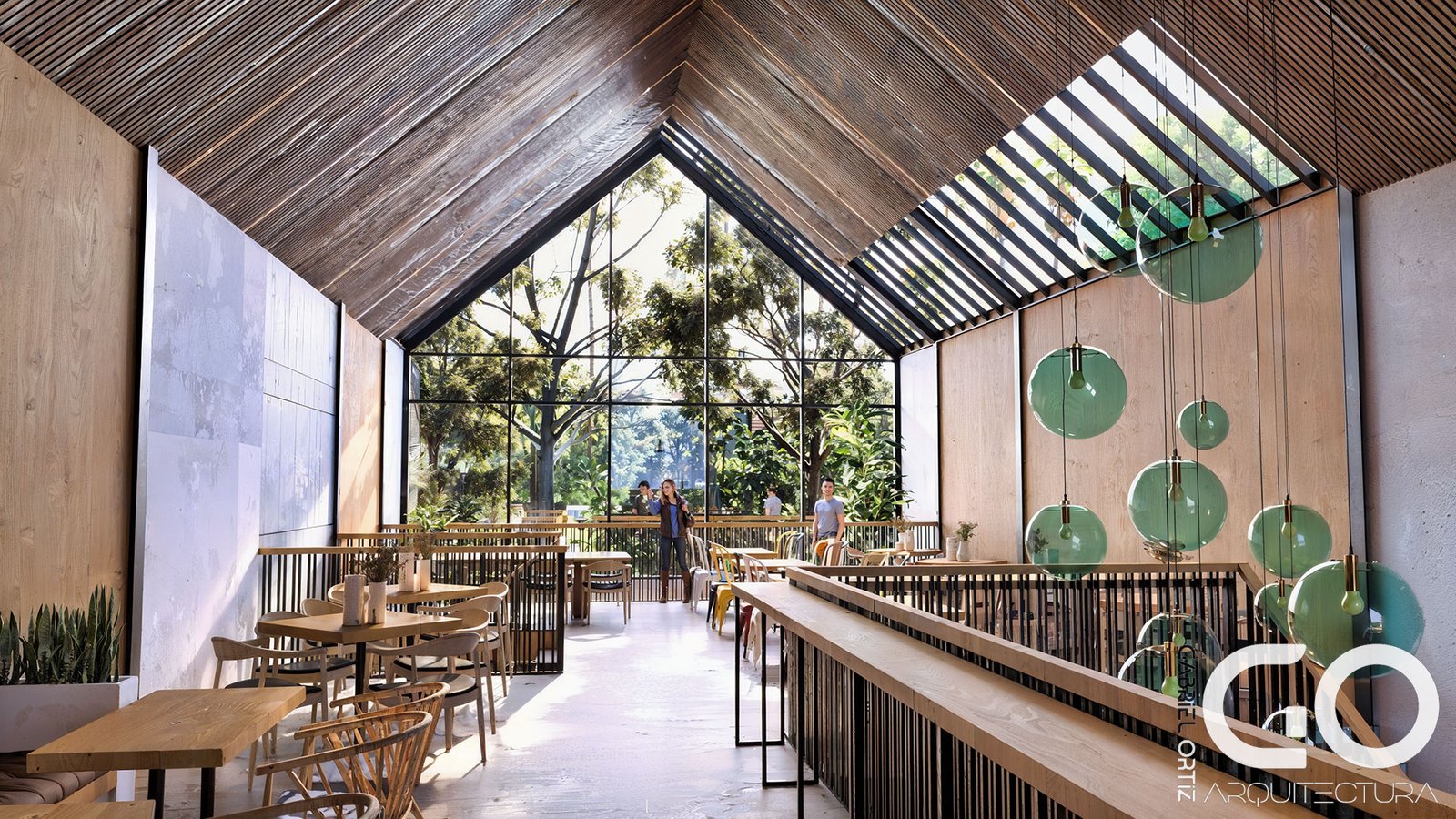 Arquitectura de niveles y luz natural: El núcleo operativo del primer nivel articula la cafetería y la cocina bajo una iluminación cenital estratégica. El uso de claraboyas y lámparas de madera no solo reduce el consumo energético, sino que resalta la transición entre pavimentos de madera natural y envolventes de papel de colgadura de diseño. La gran escalera conduce a un segundo nivel de carácter industrial, donde una estructura metálica ligera soporta la barra y culmina en un ventanal panorámico que integra la zona verde posterior.